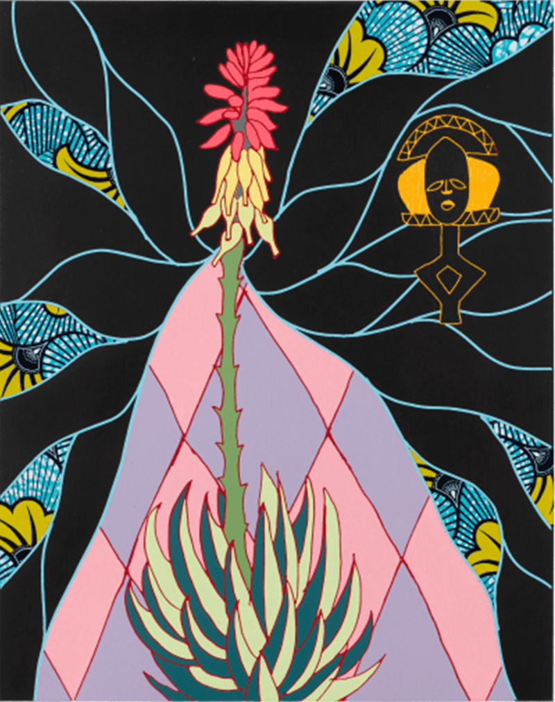 Yinka Shonibare's African Flower Magic I, 2025. Relief print with woodblock and batik fabric collage on Somerset Tub Sized Satin Radiant White 410gsm paper