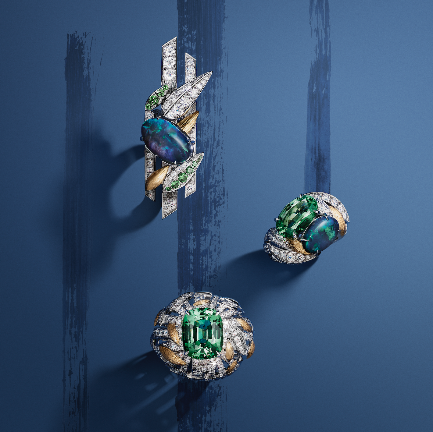 Three rings riff on the same gems and colours in striking forms. The first ring is topped with a 7.24-carat cushion-cut tsavorite garnet; the second has a Toi et moi setting of garnet and opal in a slender silhouette; and the third generously wraps the finger