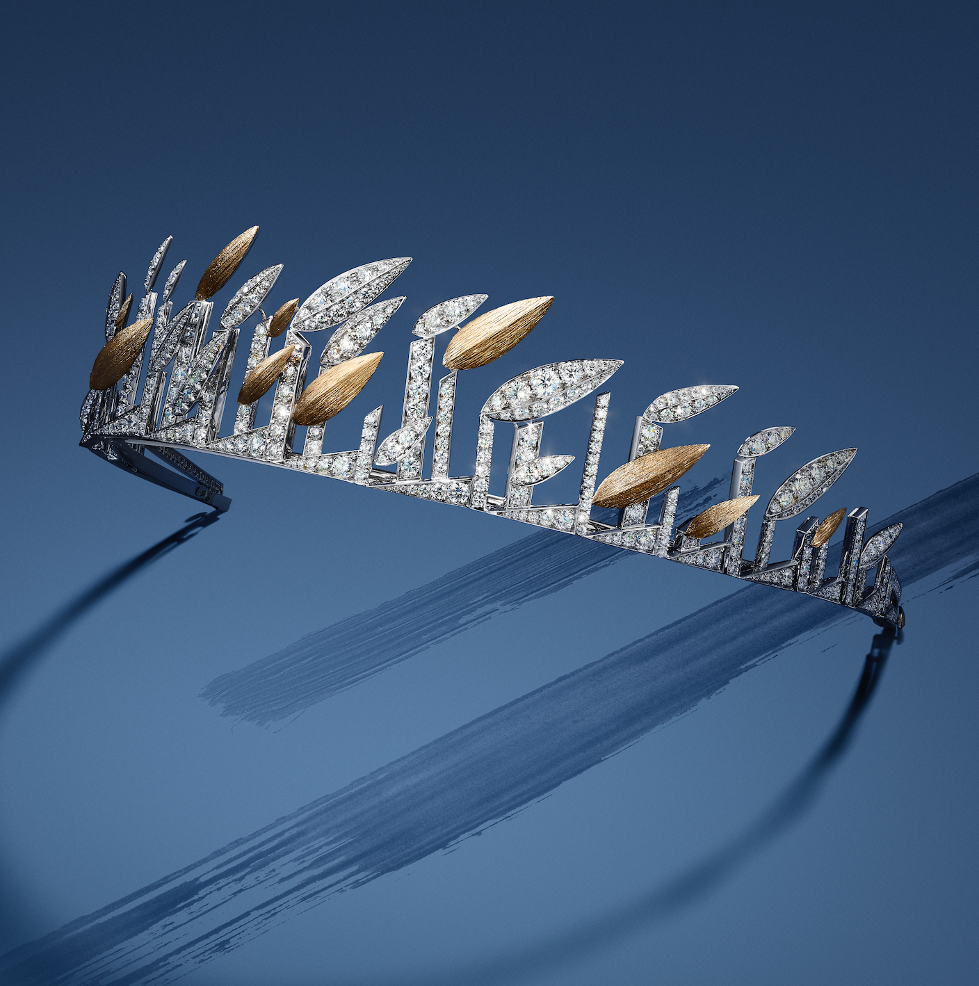 Bamboo tiara in white and yellow gold (with hand-engraved gold work), set with four brilliant-cut DE VVS diamonds of approx 0.42 carats each, and brilliant-cut diamonds