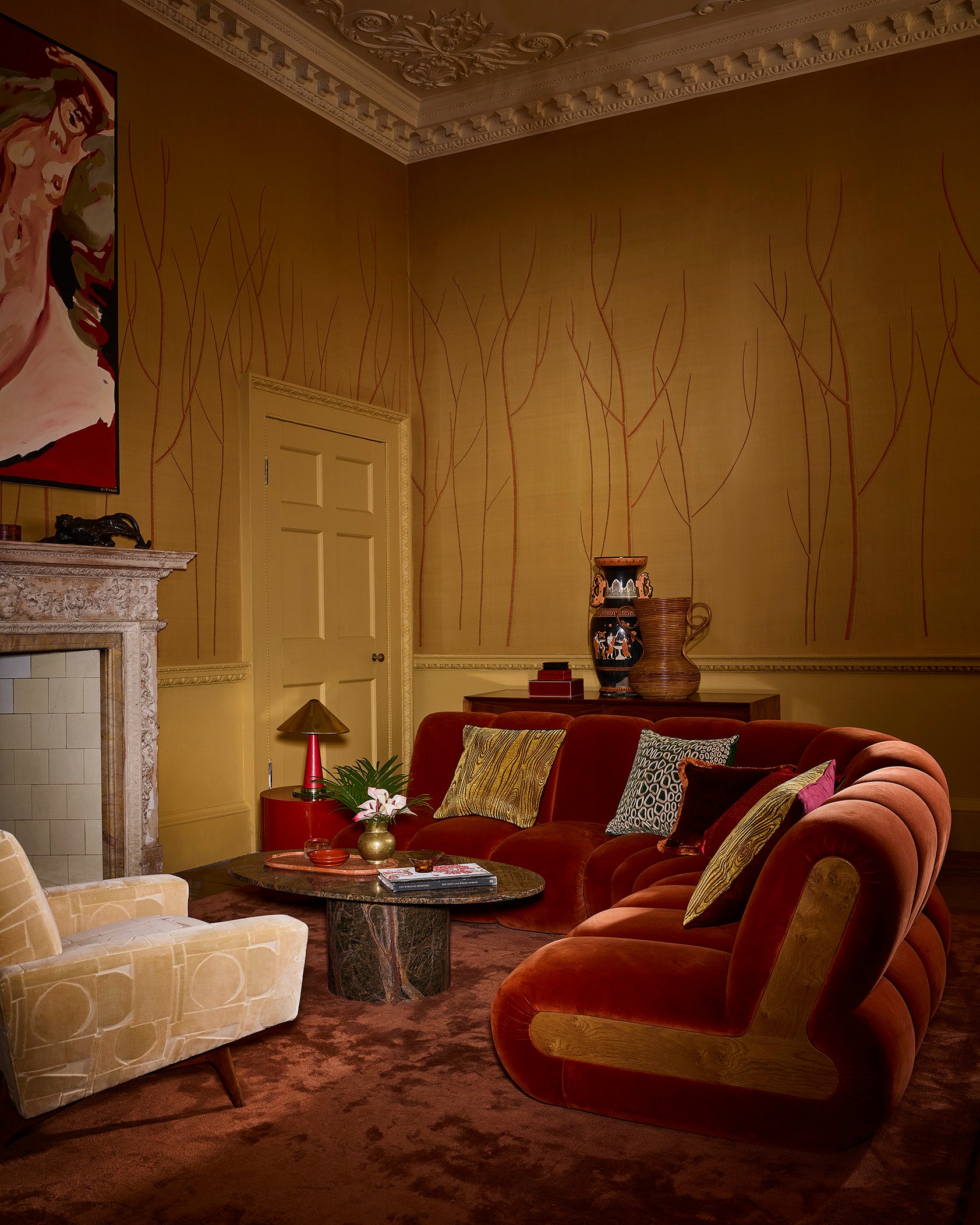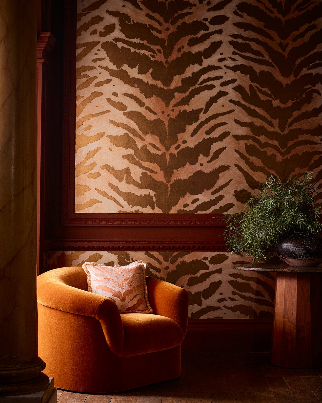 A room in Ambiguous Tiger wallpaper with a matching cushion. The original artwork was first used to create the design for Reedâs SS26 Runway Collection. Image courtesy of Fromental