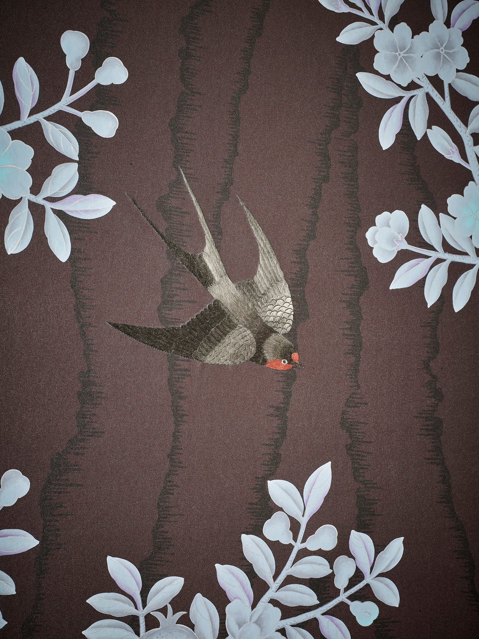 A detail of the wallcovering Wilde Dreams. The grove of flowering trees is punctuated by swallows and bees, embroidered in naturalistic tones. "These embellished characters hold special significance for Harris and husband Eitan, symbolising the constant presence of the other, even when apart". Image courtesy of Fromental