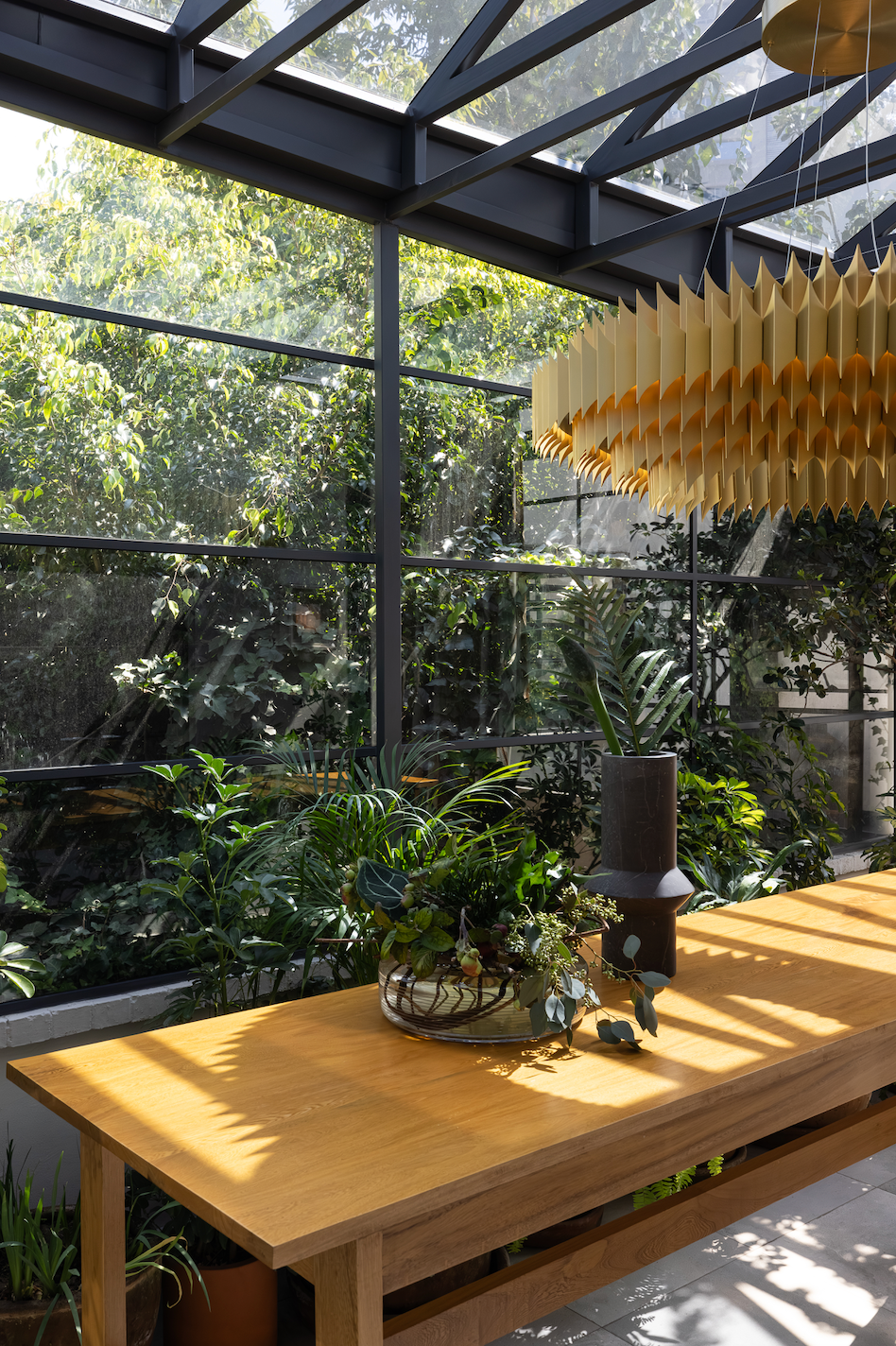 The verdancy of the garden juxtaposes with Broom's King pendant