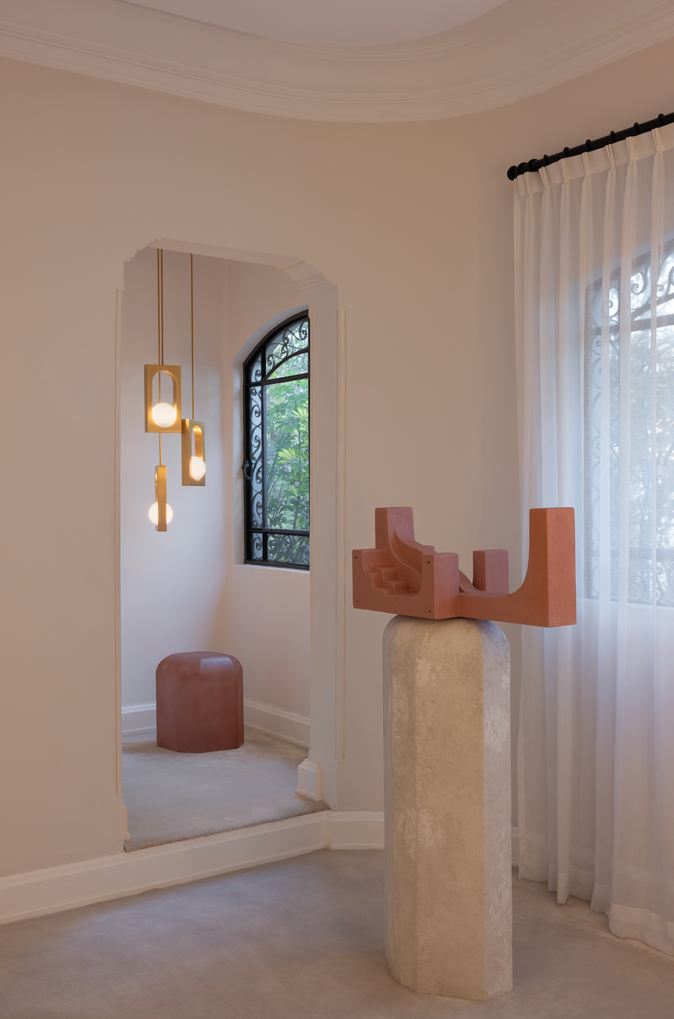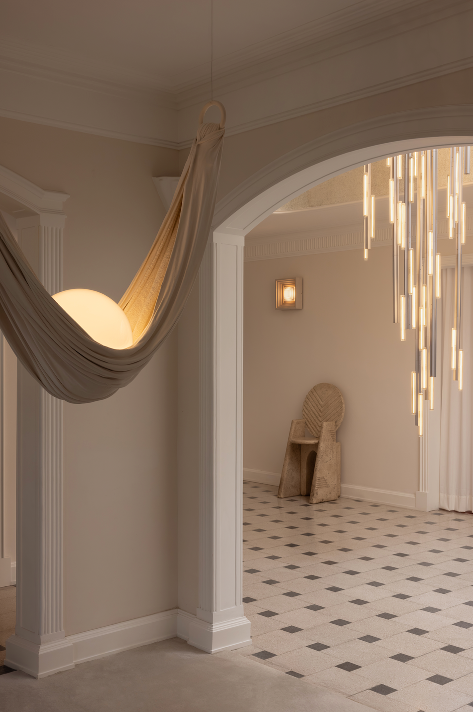 Broomâs interventions at the villa unfold in a glorious illuminated spectacle. His Hail light greets visitors in the central atrium, a colossal cascade of light wrapped by the staircase which sets the stage for his theatrical odyssey. Along the way, designs in new finishes are revealed, as well as a curation of Requiem, which includes his new wall sconce.Â