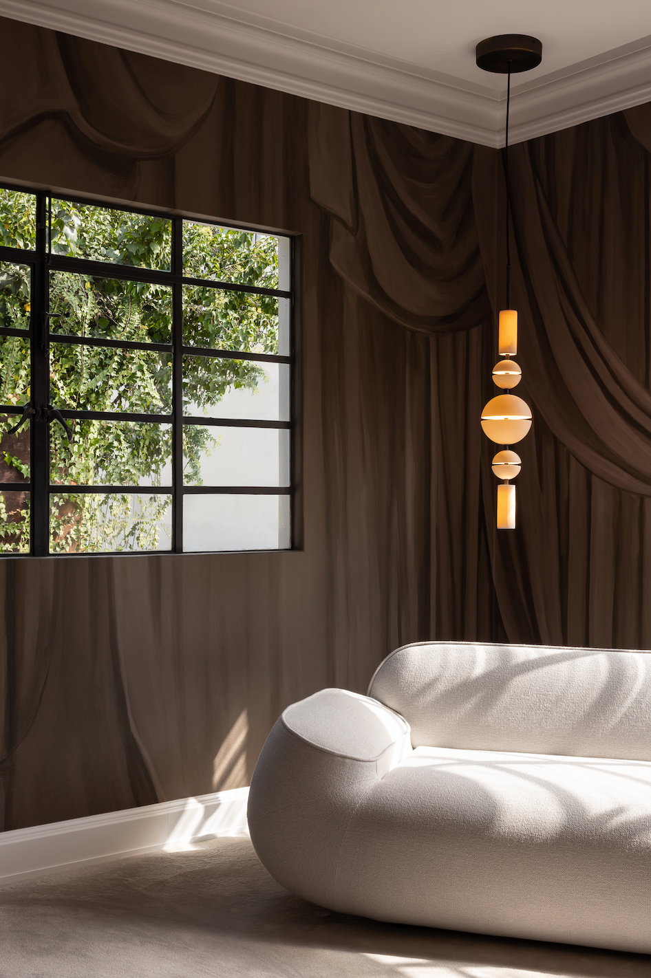 A room swathed in dark fabric sets the stage for a Cascade light