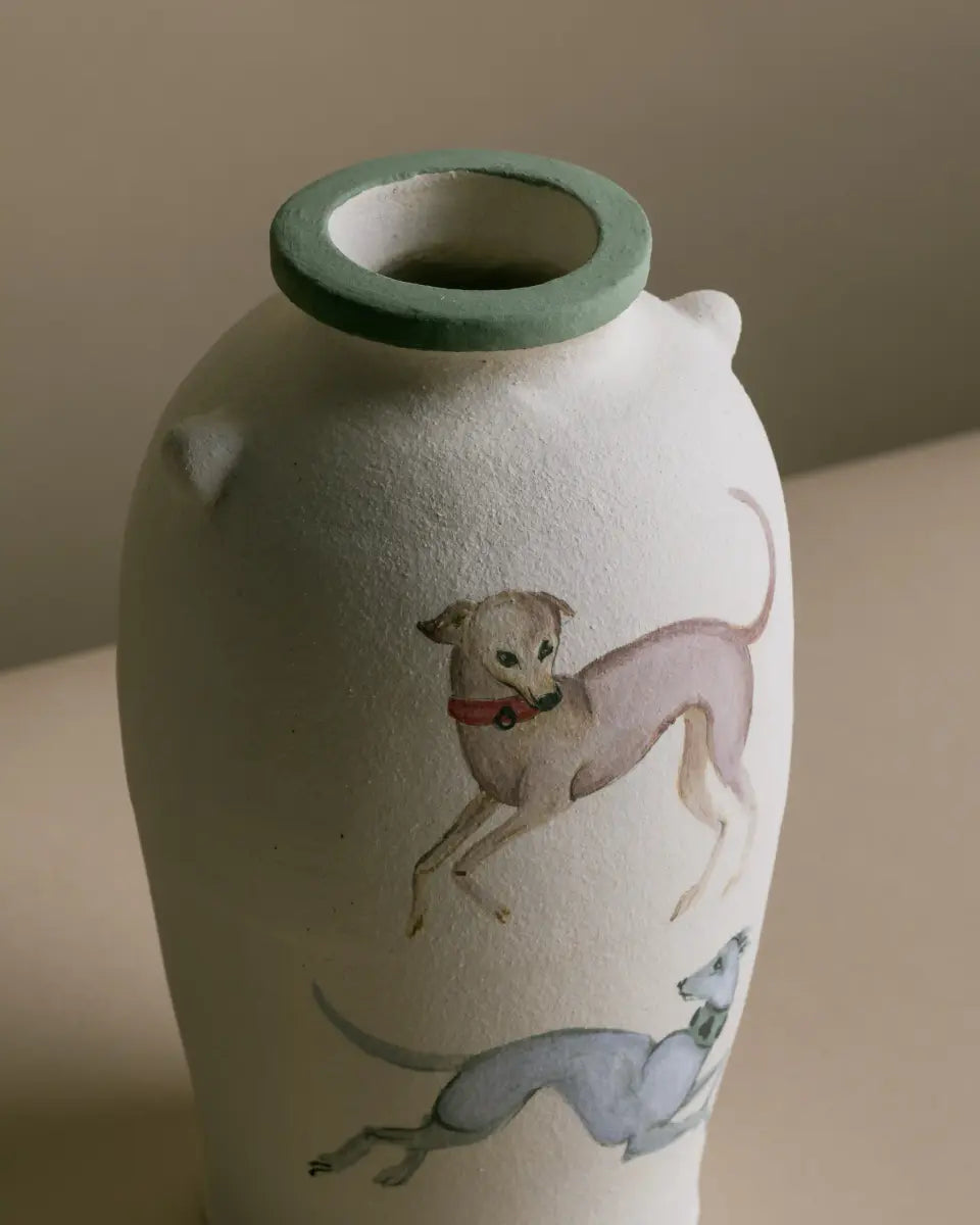 Charlotte McLeish has created an exclusive vase hand painted with folkloric hounds for the brand