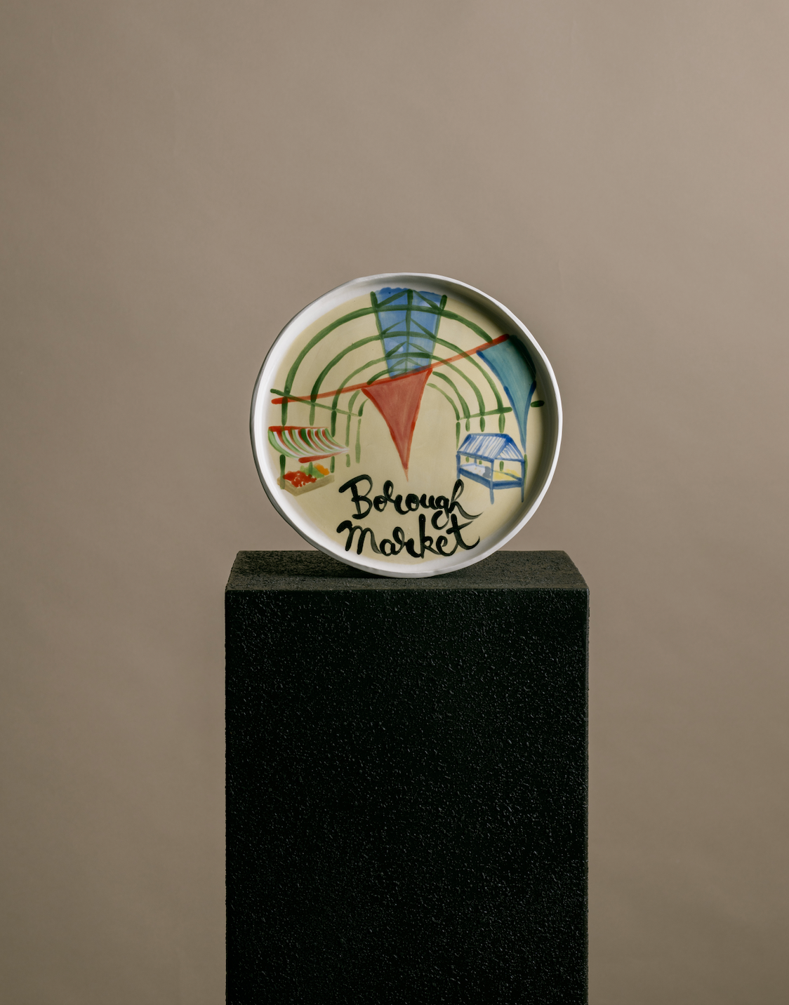 McLeish, the East London-based ceramist who uses a variety of techniques – from pinching and coiling to working at the wheel – produces ceramics referencing British folk art from the 16th and 17th century. For the Luxe Bureau, she’s created an exclusive vase hand painted with folkloric hounds (£450). Margate-based Minnie-Mae Stott, an artist producing pottery in whimsical designs melding British seaside landscapes with Greek mythology and Italian kitsch has designed a limited edition of just 20 Olive Branch Platters for the brand (£250), while Harlie Brown Studio has collaborated with Sancho and Wisely to offer vibrant and characterful Exclusive London Plates (£350 for a set of four), emblazoned with scenes of beloved London streets such as Columbia Road. Each piece produced by the studio is hand built by artist Harlie at her home studio on the Kent coast.