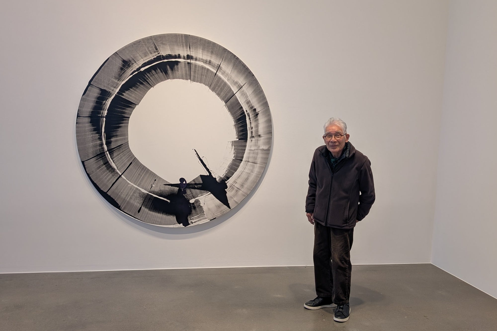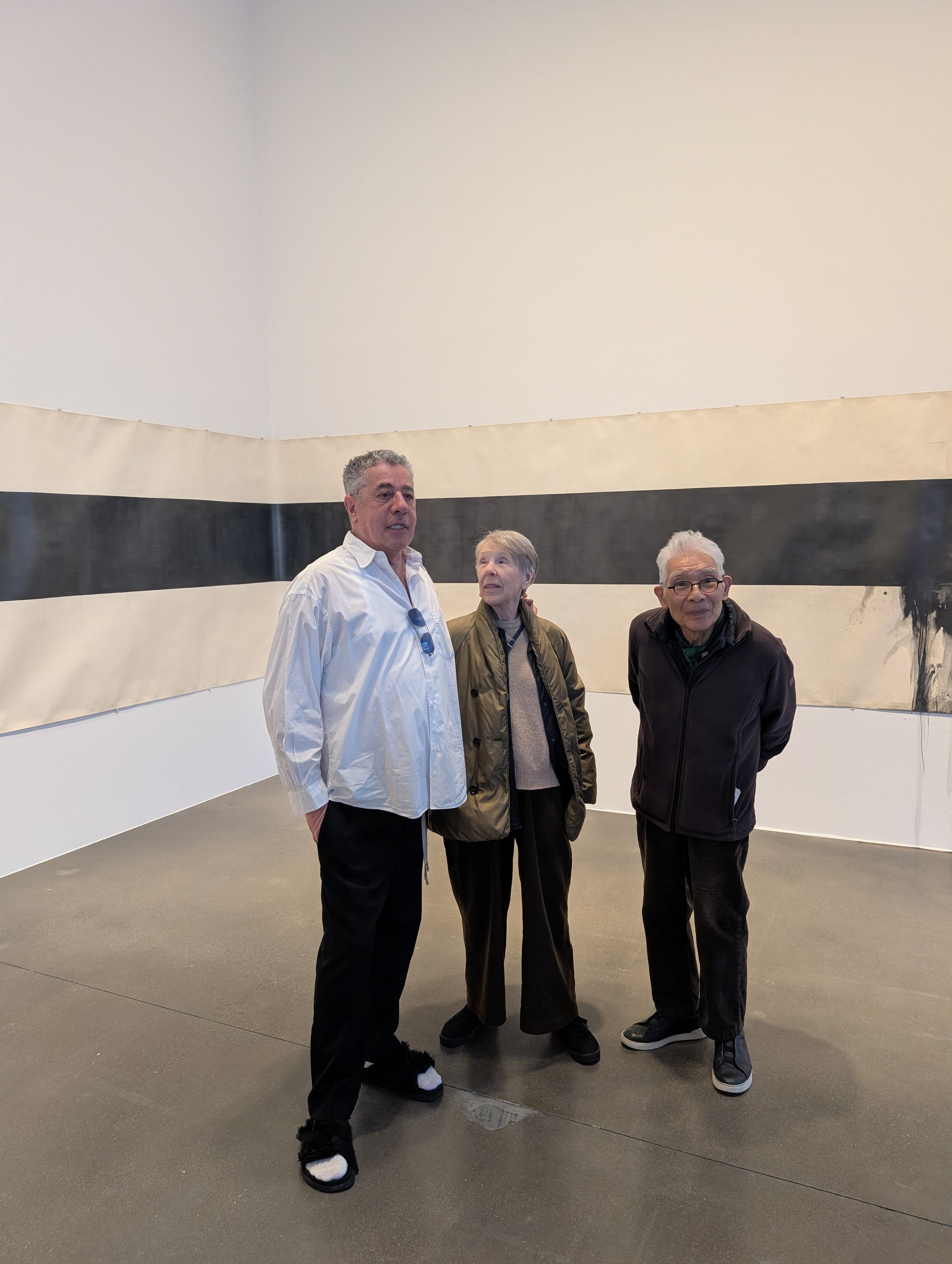 Standing in the North Gallery decades later, Matsutani stoops with age, but he and his wife are in high spirits, and light up the room. “We saw it for the first time today,” says Van Houten looking around the exhibition. Matsutani smiles, pointing to the 10-meter-long, graphite-covered scroll from his Stream series, which extends across almost two sides of the gallery. The piece embodies the philosophy of Zen – the infinite repetition of small pencil strokes is an act of contemplation and persistence. “We were here this morning to finish this piece,” he says. Traces of graphite stain the gallery wall testifying to his intervention.