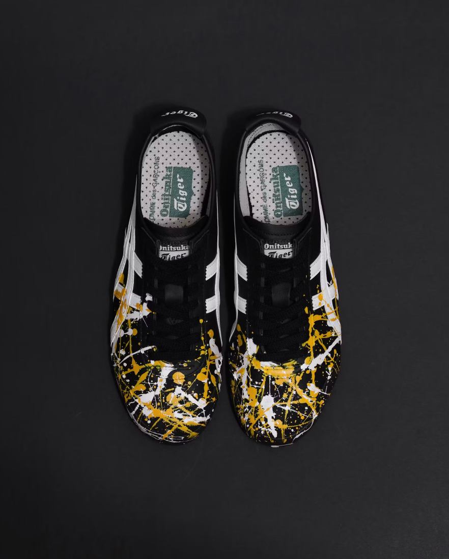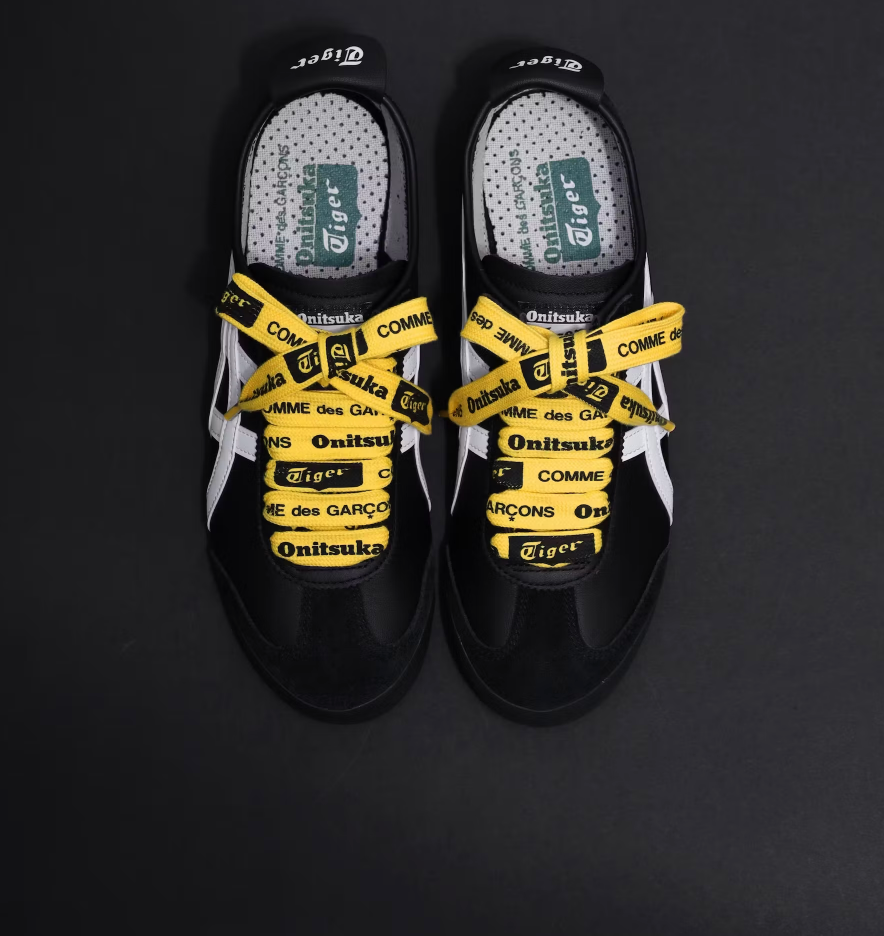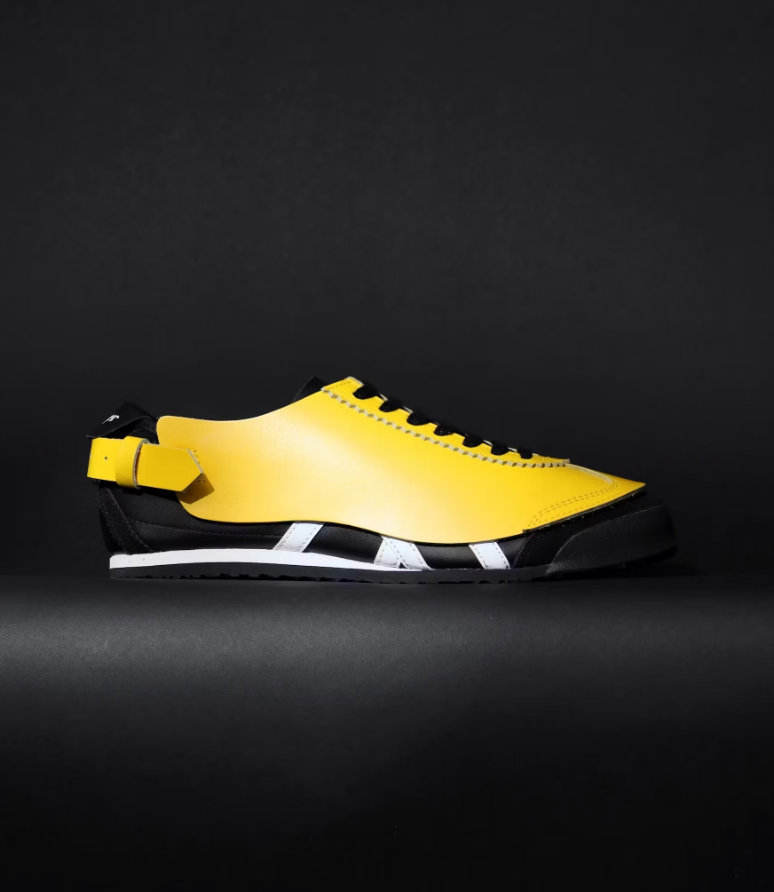 Onitsuka Tiger’s Mexico 66 is a trailblazer that continues to evolve. The latest vision for the sneaker comes from Rei Kawakubo who has creating four customised designs within a capsule collection for the Onitsuka Tiger x Comme des Garçons pop-up shop collaboration. In Kawakubo’s reinterpretation, the 66 is jet black and paint splattered; embellished with swirling gold circles; black with chunky logo-stamped laces; or hazard sign yellow and black with a buckle at the back. The designs are fresh, new, slick. But the striped leather overlay on each side of the shoes, even when partly concealed, is unmistakable – the mark of a Japanese sneaker legend.Â